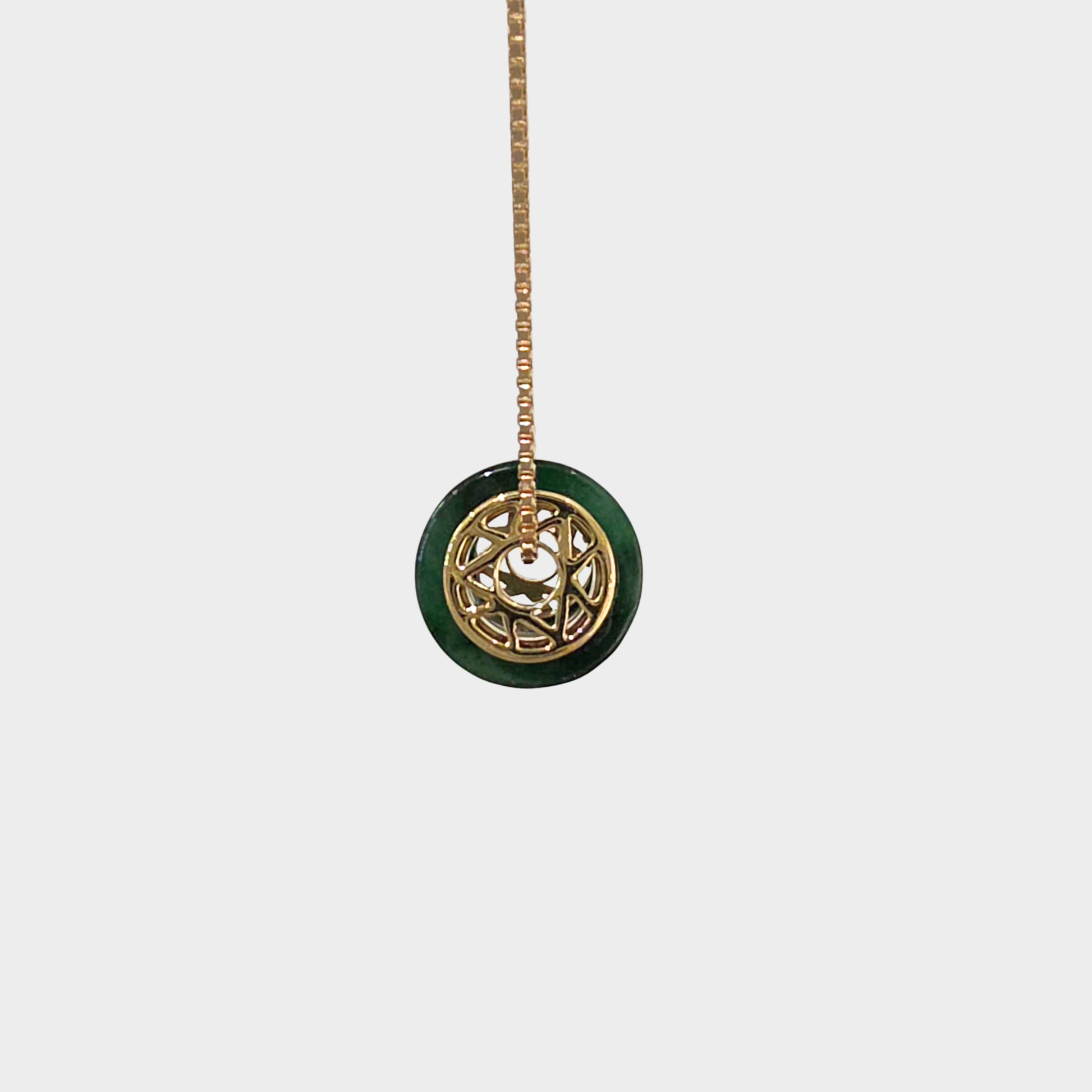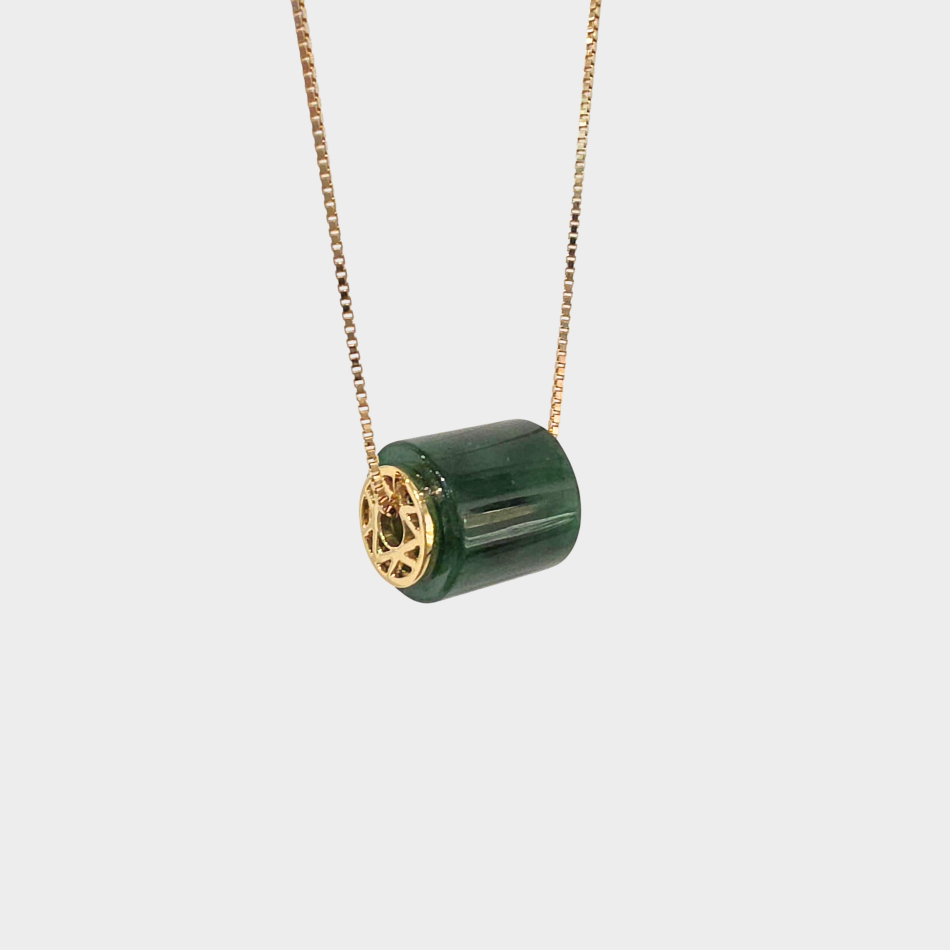 This highly translucent "barrel" pendant showcases a statement design on both sides, carved with premium 18K yellow gold, creating a refined aesthetic that transcends seasonal trends. The symmetrical design on both surfaces ensures captivating detail from every angle. -Harmonising Tradition and Style
