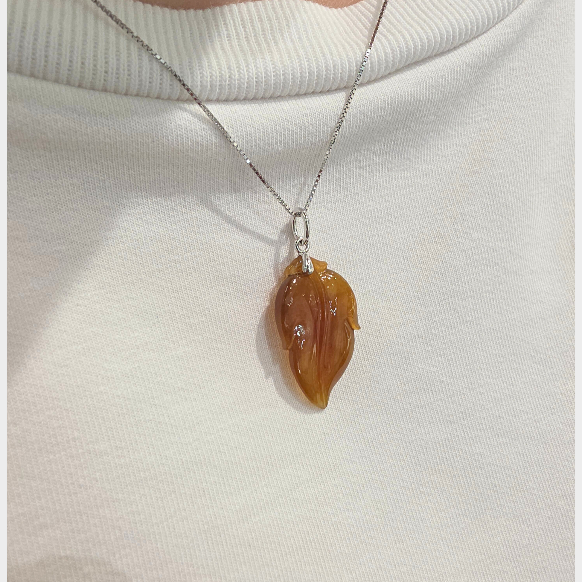 This exquisite pendant features an intricately carved leaf shape crafted from vibrant red jadeite jade, renowned for its rich colour and exceptional translucency. -Timeless beauty truly shines through!