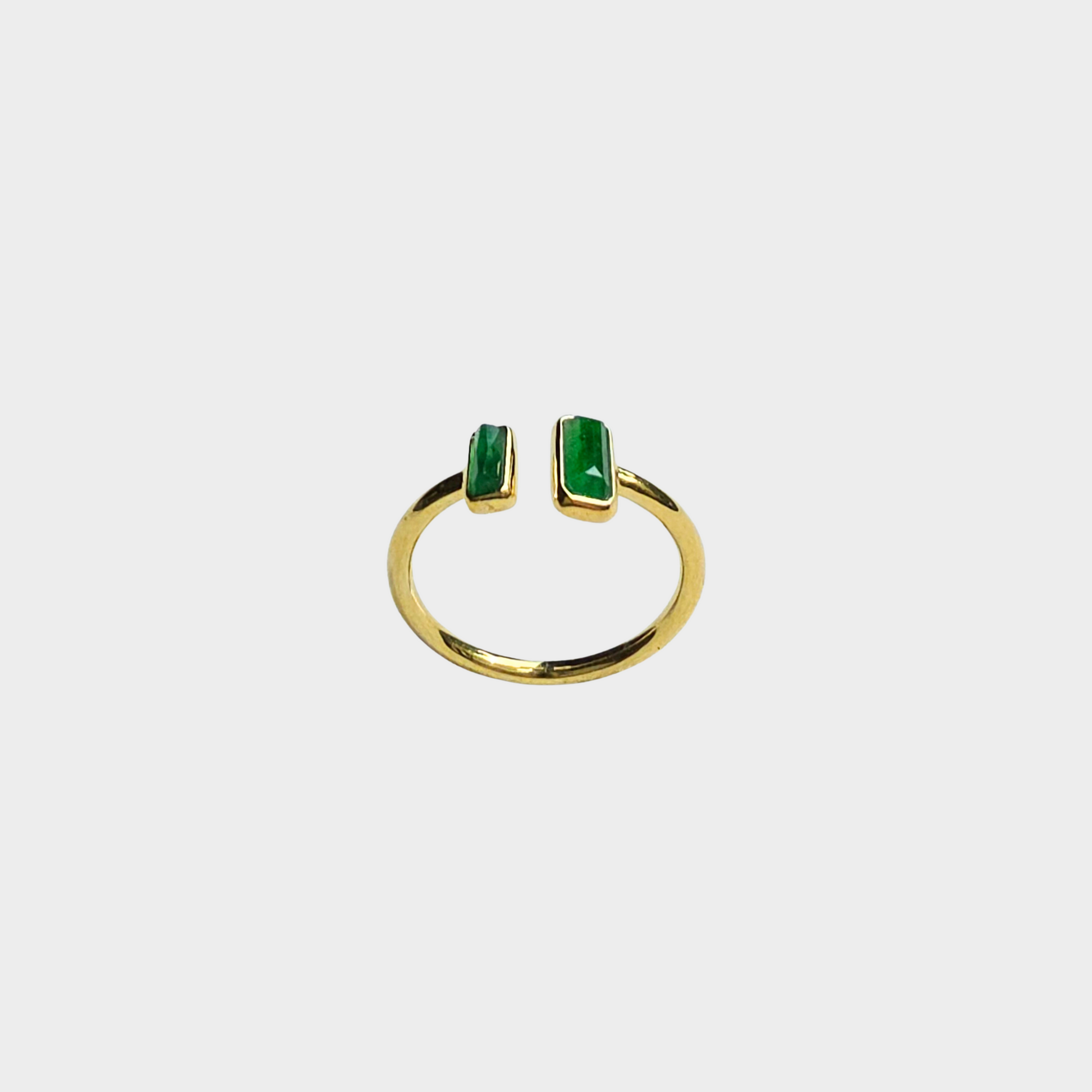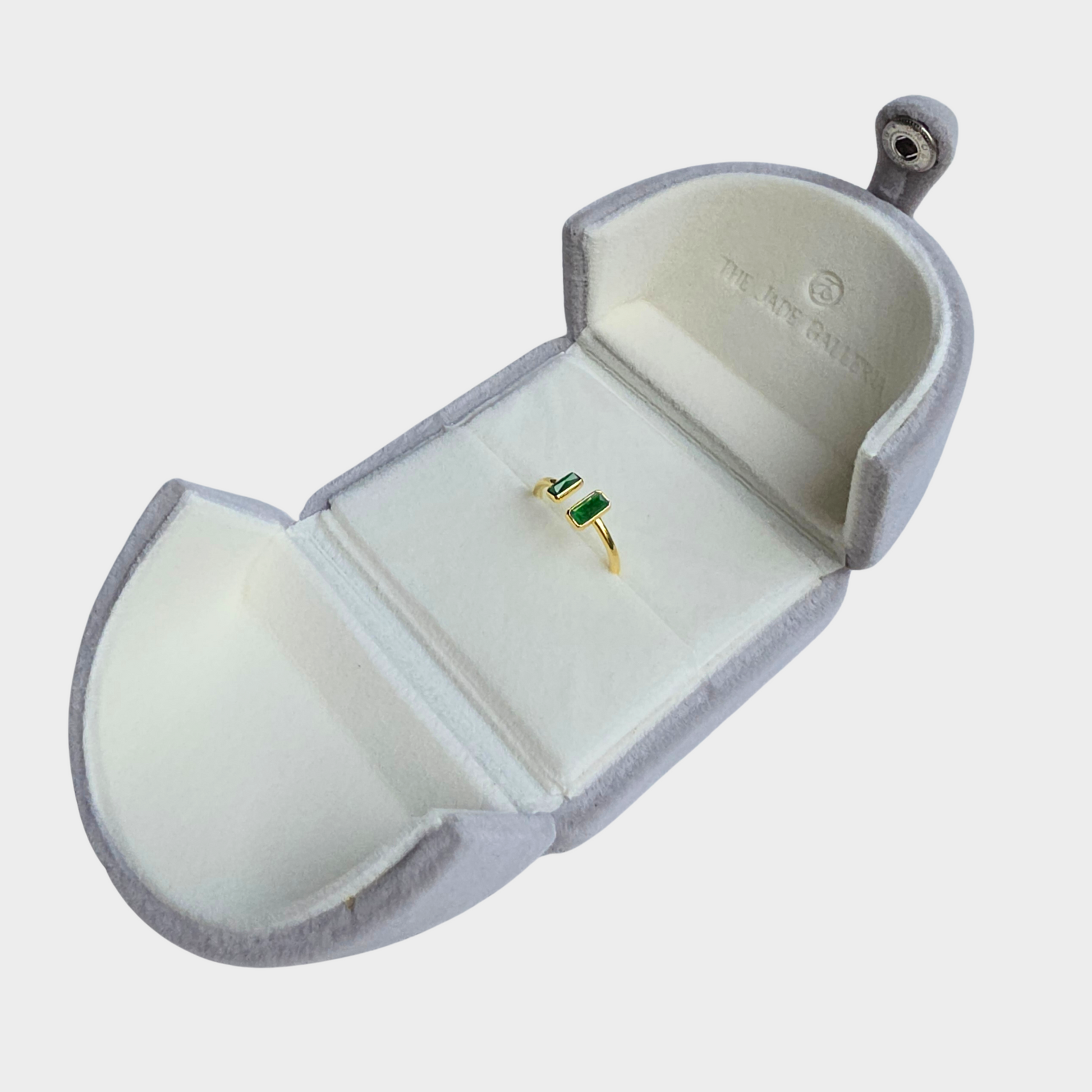 This exquisite ring features two rectangular green jadeite jade stones of exceptional translucency, elegantly set in 18K yellow gold. -Simple elegance.