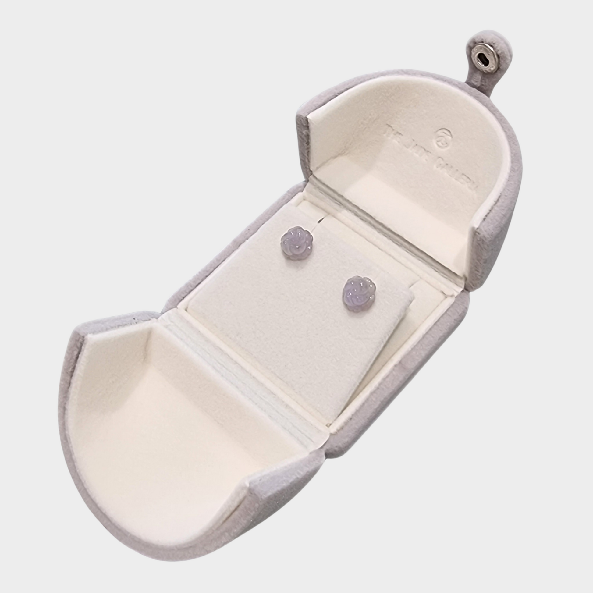 A pair of translucent lavender Jade stud earrings set in yellow gold. Each earring is adorned with intricately designed flower accents, adding a touch of floral grace and timeless charm. -Blooming Flowers!