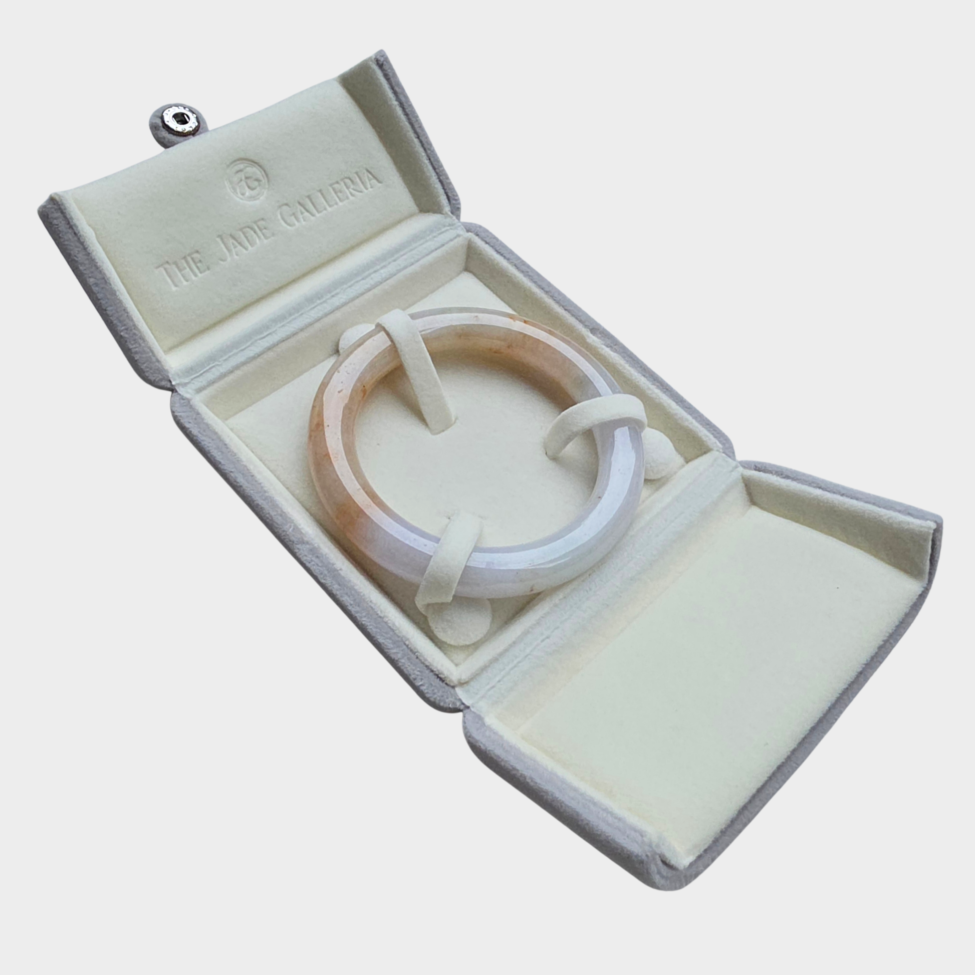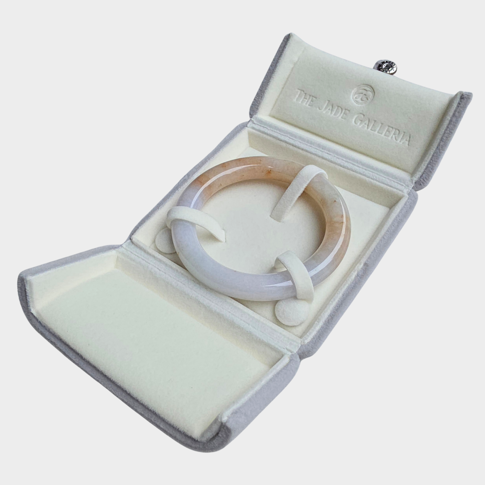 This exquisite jadeite jade bangle showcases a striking natural colour division, with translucent white jade flowing seamlessly into warm orange-red tones that evoke the serene beauty of a sunset. -Match your distinctive style.