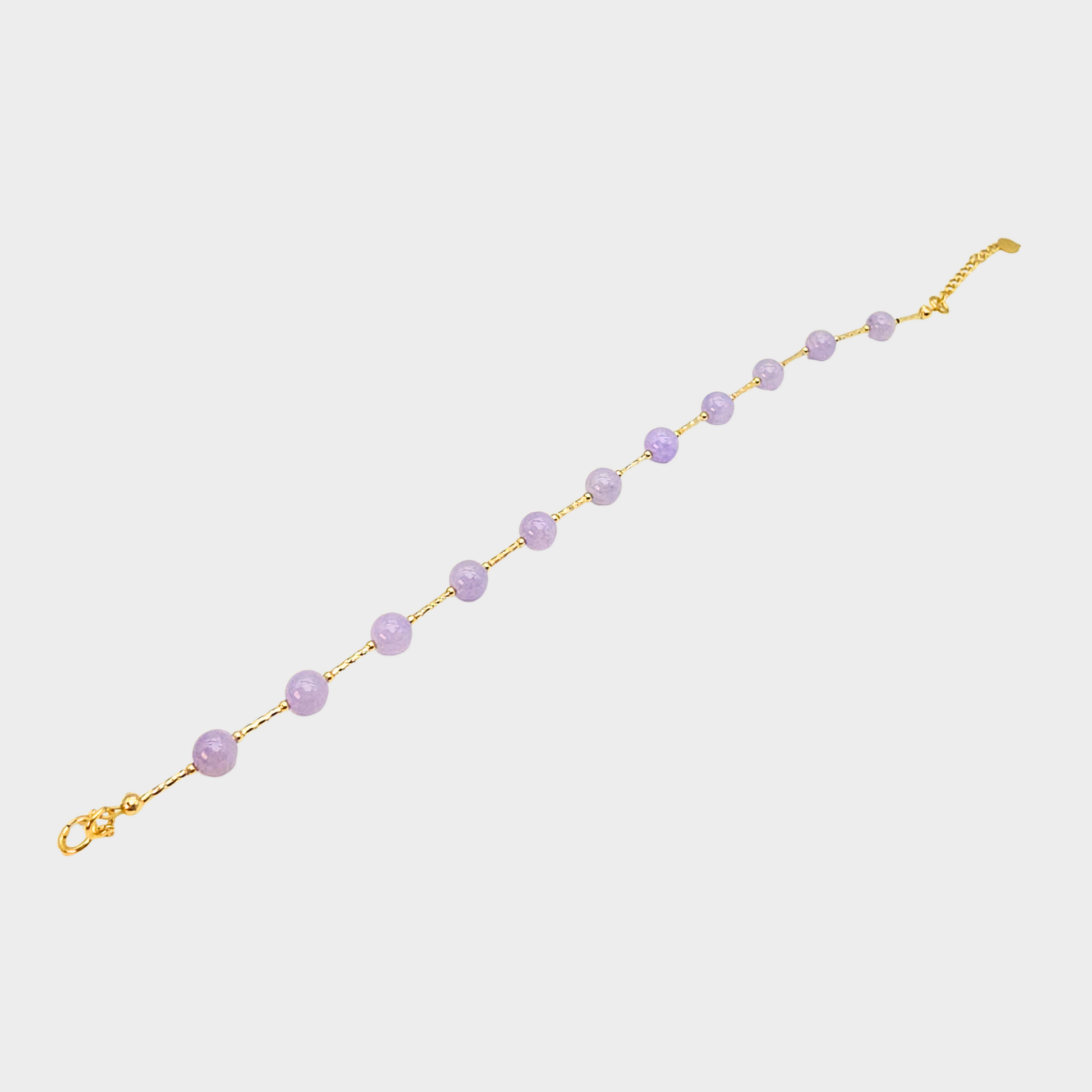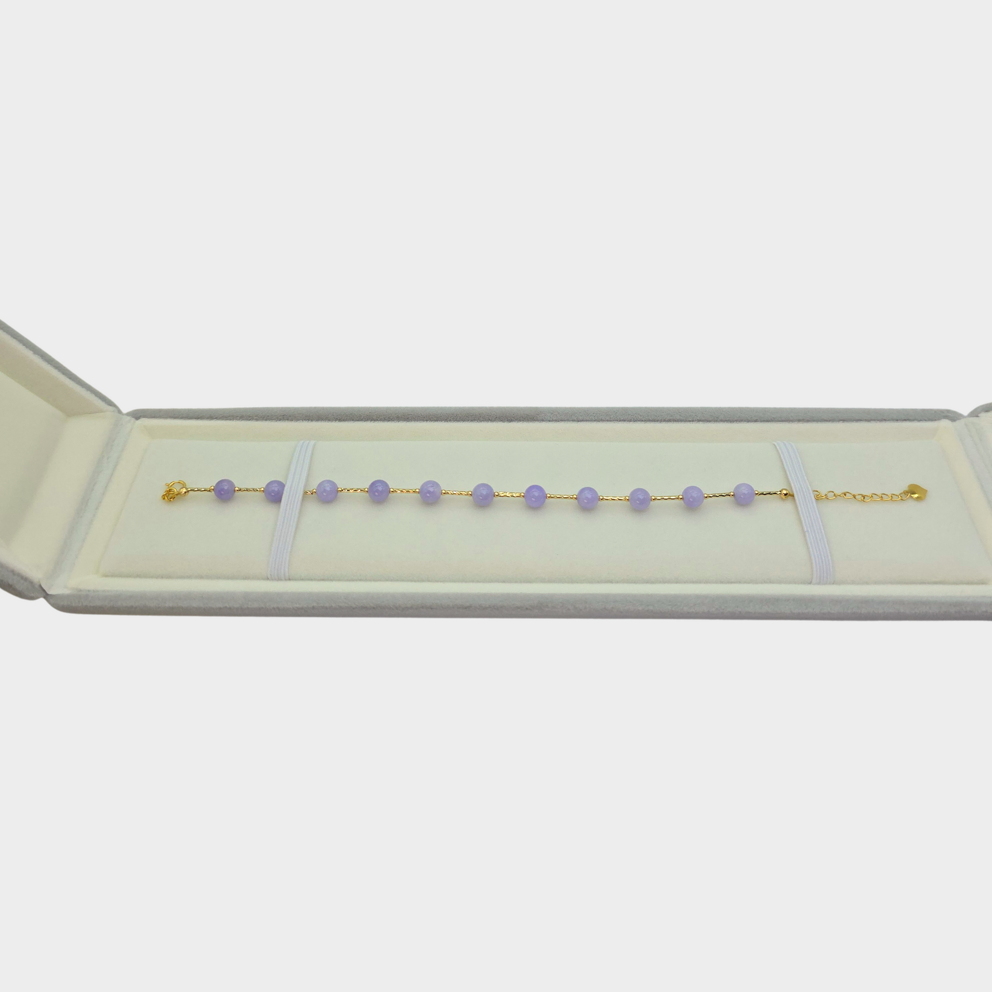 This bracelet showcases 11 vibrant lavender jadeite jade beads, enhanced with elegant yellow gold accents. It offers a sophisticated touch to your look and makes an exquisite complement to any jewellery collection.